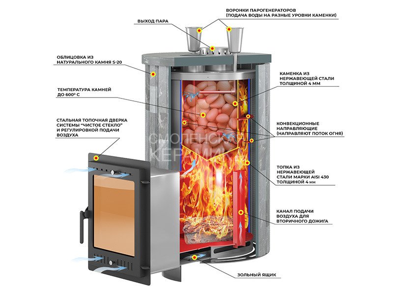 Конструкция печи включает в себя закрытую каменку из нержавейки марки AISI-430 толщиной 4 мм, расположенную в верхней части топки. Каменка размещена прямо на пути пламени и дымовых газов, что позволяет нагреть камни до температур свыше 600°C.