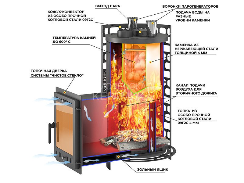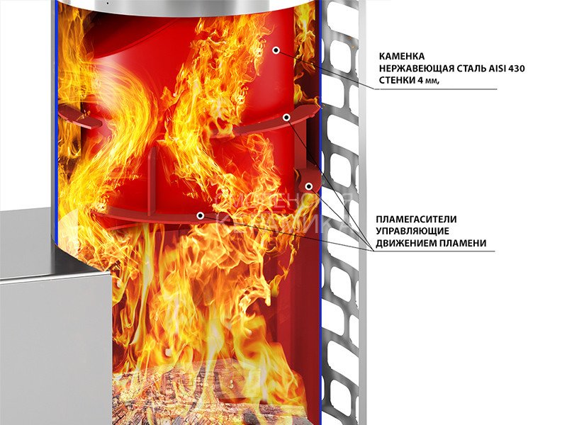 Конструкция печи включает в себя закрытую каменку из нержавейки марки AISI-430 толщиной 4 мм, расположенную в верхней части топки. Каменка размещена прямо на пути пламени и дымовых газов, что позволяет нагреть камни до температур свыше 600 градусов по Цельсию.