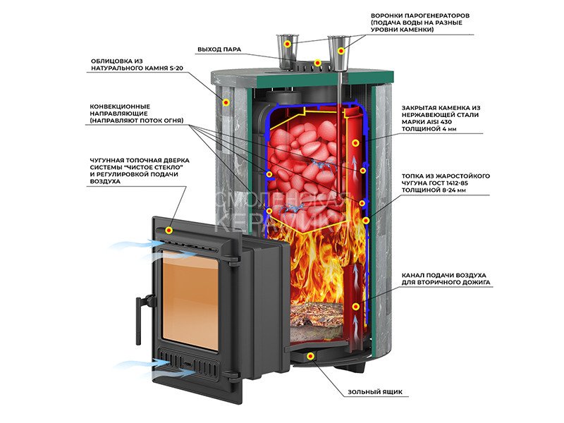 Верхняя часть топки изготовлена из чугунных колец. Между топкой и крышкой размещено два кольца высотой 120 мм. Для полного сгорания топлива в топке устроены каналы вторичного дожига, подающие воздух из поддувала в верхние точки камеры, в места скопления разогретых газов. Облицовка сделана из отдельных планок или полос натурального камня, которые называются ламелями.