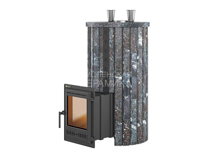 Закрытая каменка печи изготовлена из нерж. стали марки AISI 430 толщиной 4 мм. Каменка размещается прямо на пути пламени и горящих газов, что позволяет нагревать камни со всех сторон и быстро достигать температуры 450-500°C. Форма каменки обеспечивает максимальное снятие энергии с горящих в топке дров. Объём топки рассчитан на размещение 25-40 кг камней для бани. Для подачи воды в каменку предусмотрены 2 заливные воронки, направляющие воду в нижний и средний ярус заклада каменки. Это позволяет легче управлять паром и получать пар разной степени насыщенности. Облицовка сделана из отдельных планок или полос натурального амфиболита.