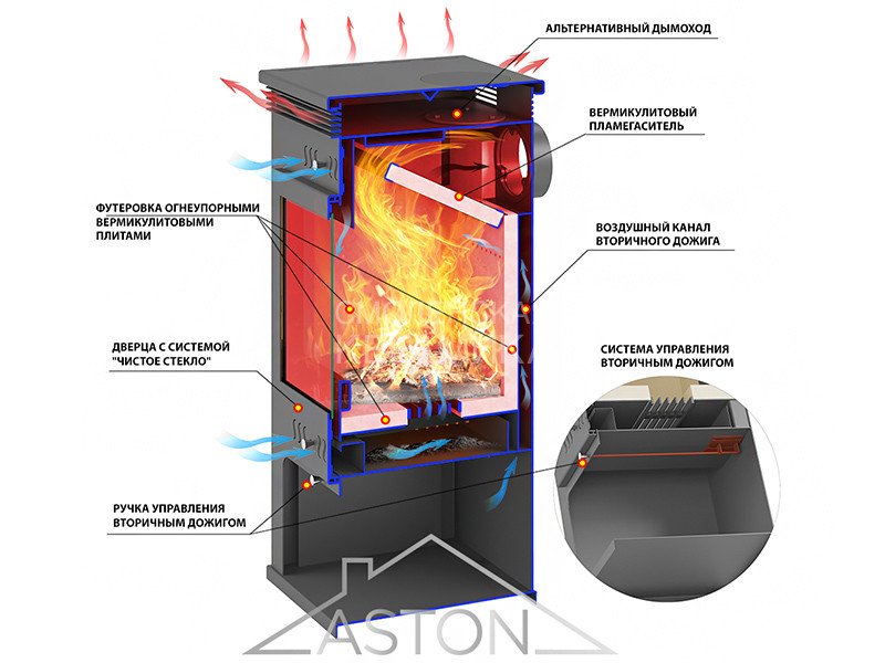 Печь-камин АСТОН 11 кВт изготовлена из особо прочной котловой стали марки 09Г2С. Наиболее термонагруженные участки выполнены из нержавеющей стали марки AISI 430. Печь работает на дровах и рассчитана на пристенное размещение.
