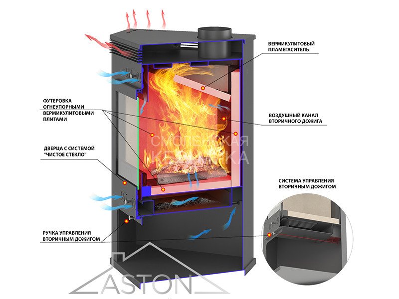 Низ топки спереди ограничен стальной пластиной с узором в дизайне АСТОН для предотвращения выпадения дров и раскалённых углей из топочного пространства вперёд.