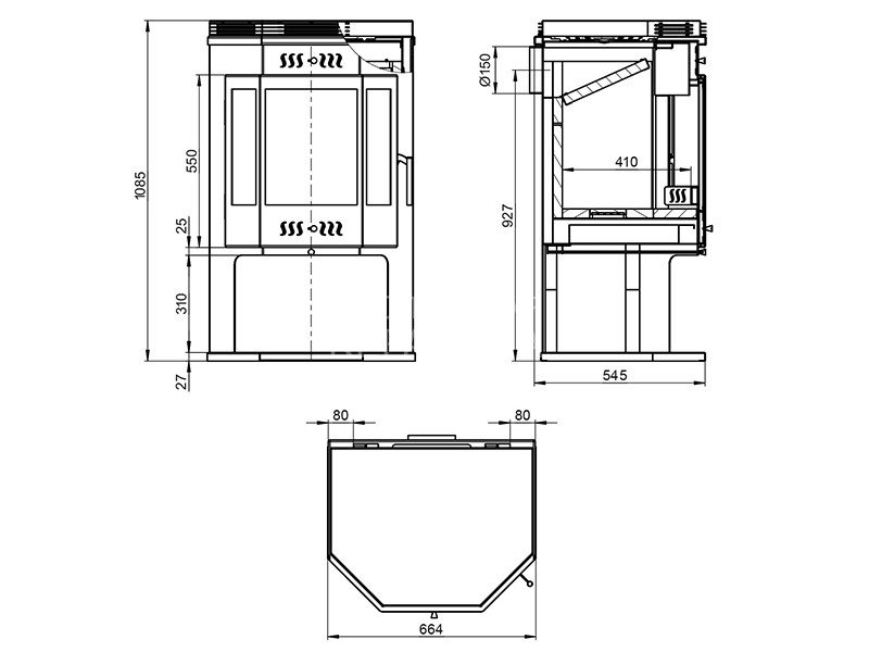 Топка в горизонтальной проекции имеет форму призмы, что позволяет размещать дрова как вдоль, так и поперёк топочного пространства. Длина используемых дров – до 45 см.