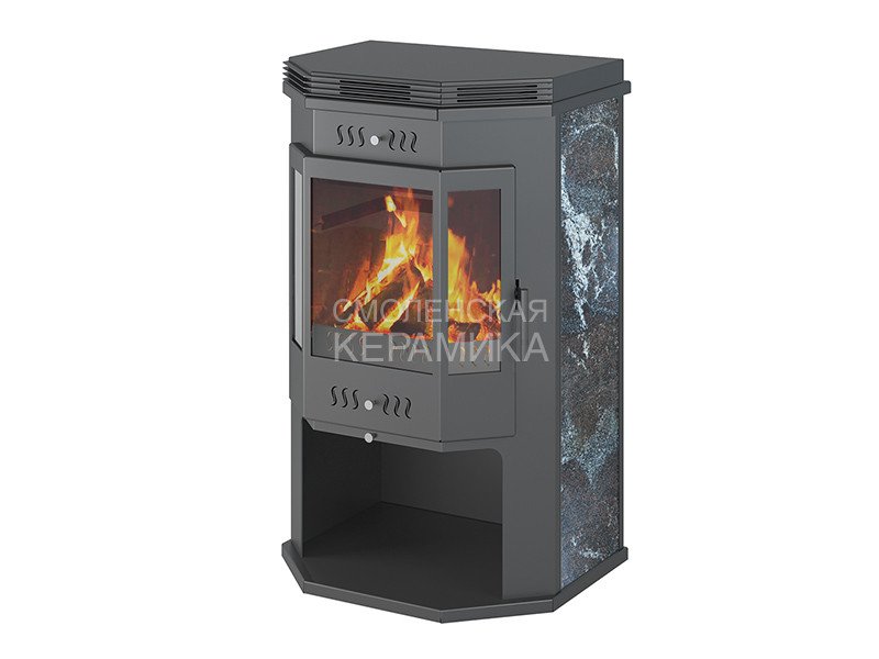 Печь-камин ASTON 12 кВт (200 м3) Призматик с плитой (Амфиболит) изготовлена из особо прочной котловой стали марки 09Г2С. Наиболее термонагруженные участки выполнены из нержавеющей стали марки AISI 430. Печь работает на дровах и рассчитана на пристенное размещение. Номинальная мощность печи – 12 кВт, что позволяет отапливать помещение объёмом до 200 м³.