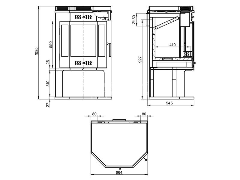 Топка в горизонтальной проекции имеет форму призмы, что позволяет размещать дрова как вдоль, так и поперёк топочного пространства. Длина используемых дров – до 45 см.