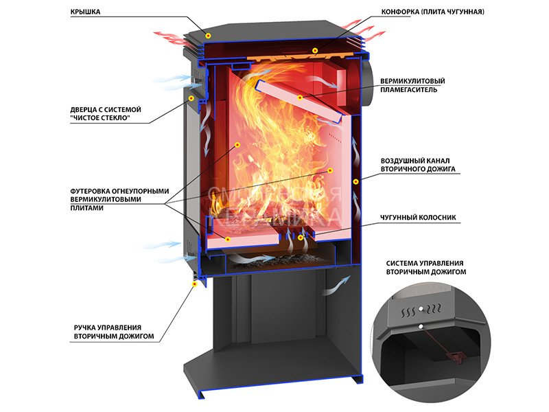 На дне топочной камеры размещается чугунный колосник, через который подаётся воздух для горения.