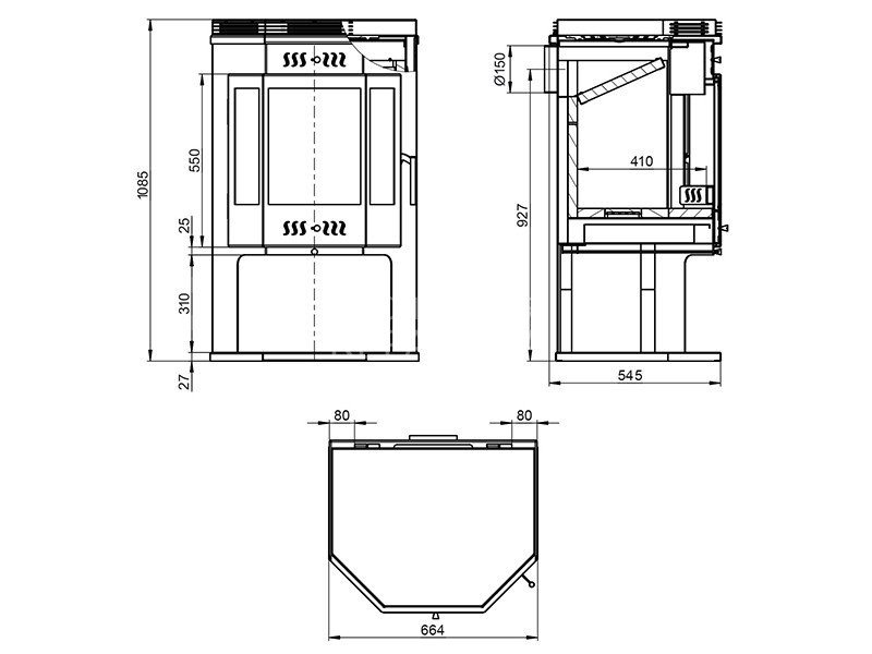 Топка в горизонтальной проекции имеет форму призмы, что позволяет размещать дрова как вдоль, так и поперёк топочного пространства. Длина используемых дров – до 45 см.
