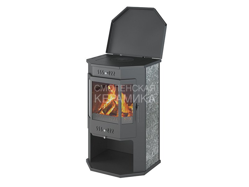 Печь-камин ASTON 12 кВт (200 м3) Призматик с плитой (Пироксенит Элит) изготовлена из особо прочной котловой стали марки 09Г2С. Наиболее термонагруженные участки выполнены из нержавеющей стали марки AISI 430. Печь работает на дровах и рассчитана на пристенное размещение. Номинальная мощность печи – 12 кВт, что позволяет отапливать помещение объёмом до 200 м³.