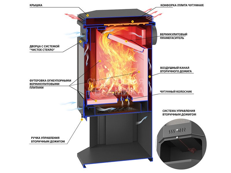 На дне топочной камеры размещается чугунный колосник, через который подаётся воздух для горения.