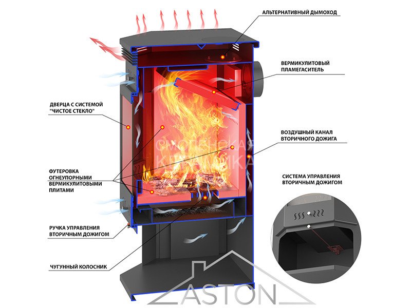 Топка камина футерована вермикулитовыми плитами, которые защищают боковые стенки и дно топки от тепловой нагрузки. Во время топки вермикулит накапливает большое количество тепла, которое постепенно отдаёт в окружающее пространство. Это позволяет печи-камину дольше оставаться тёплым и поддерживать вокруг комфортную температуру.
