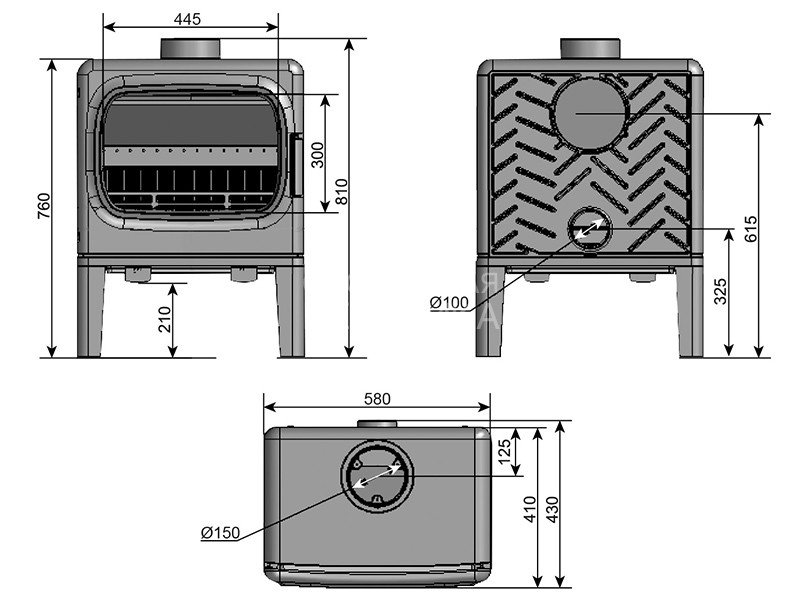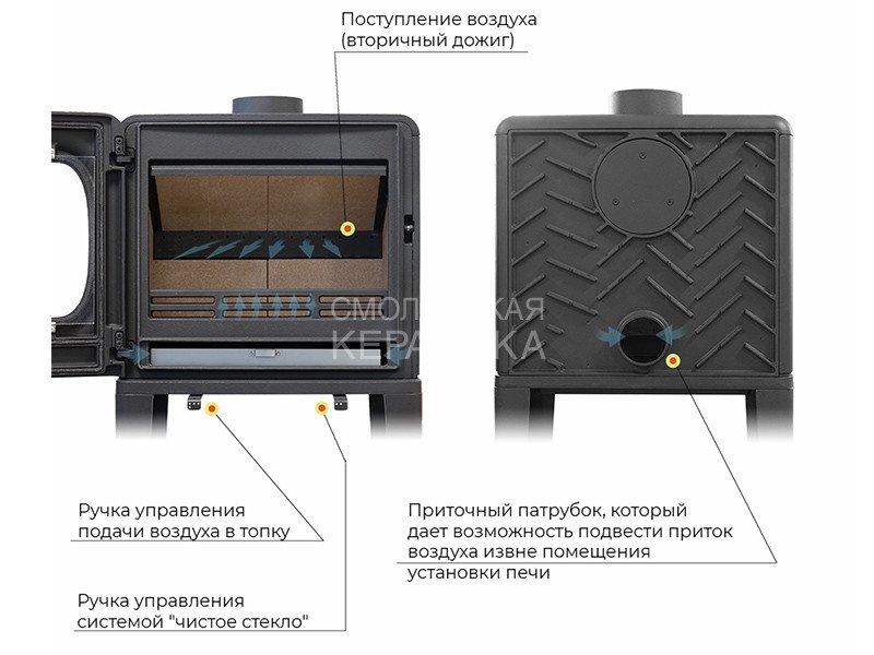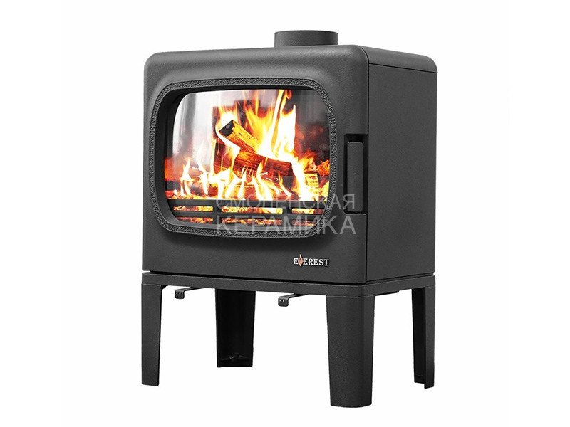 Печь-камин EVEREST F10 изготовлена из качественного жаростойкого чугуна с толщиной стенок 6-8 мм. Модель рассчитана на обогрев помещений объёмом до 200м³. Печь-камин имеет два пламегасителя: самый нагруженный пламегаситель изготовлен из вермикулита, второй из особо прочной котловой стали 09Г2С. Топка печи-камина усилена вермикулитовыми плитами с системой двухуровневого вторичного дожига. С помощью этой функции по каналам подачи вторичного воздуха поступает воздух, который нагревается при прохождении между топочной камерой и стенками корпуса. Далее нагретый воздух через дефлектор поступает в топку, перемешивается с газами - продуктами горения, чем вызывает повторное возгорание. Регулировка этой системы, как и подача воздуха в колосниковую зону, осуществляется рычагом, расположенным слева в нижней части печи-камина. В правой нижней части расположена ручка регулировки системы чистое стекло, которая помогает оставаться стеклу чистым. Патрубок дымохода Ø 150мм – универсальный, со сменным положением.