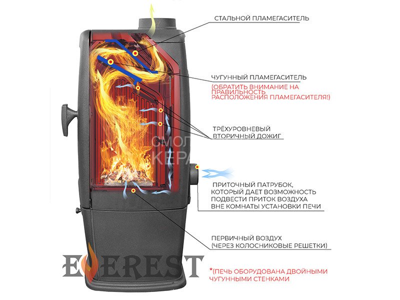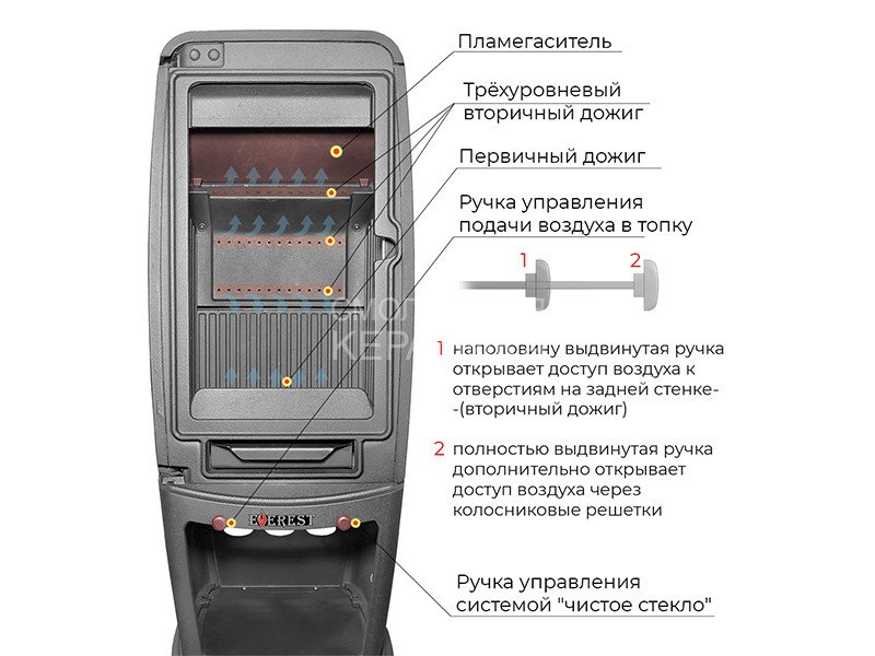 Топка печи-камина усилена чугунными вставками с системой трехуровневого вторичного дожига. С помощью этой функции по каналам подачи вторичного воздуха поступает воздух, который нагревается при прохождении между топочной камерой и стенками корпуса. Далее нагретый воздух через дефлектор поступает в топку, перемешивается с газами - продуктами горения, чем вызывает повторное возгорание. Регулировка этой системы, как и подача воздуха в колосниковую зону осуществляется рычагом, расположенным слева в нижней части печи-камина.