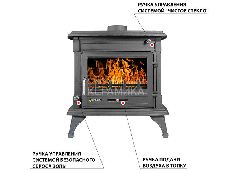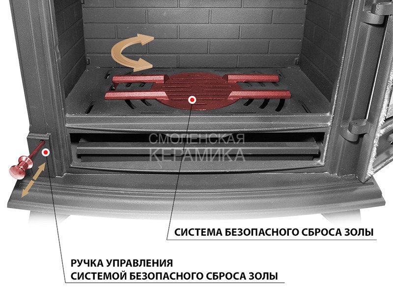 Топочная камера ограничена двойными чугунными стенками сзади и по бокам. Нижняя панель представляет собой колосниковую решётку с поворотным механизмом. Ручка поворотного устройства выходит на переднюю панель печи и позволяет сбрасывать излишки золы и мелких углей в зольный ящик, не открывая двери печи. Дверь изготовлена из чугуна, оснащена большим панорамным стеклом. Чистота стекла во время работы обеспечивается системой подачи воздуха на внутреннюю сторону стекла. Воздух отсекает дымовые газы и пламя от поверхности стекла, предотвращая закопчение и потемнение стекла. Ручка управления системой размещена в правой верхней части передней панели, над дверью. В нижней части двери размещена задвижка для подачи воздуха на первичное горение. Вторичный дожиг в печи-камине обеспечивается двойными боковыми стенками: здесь между стенкой и внутренней облицовкой т