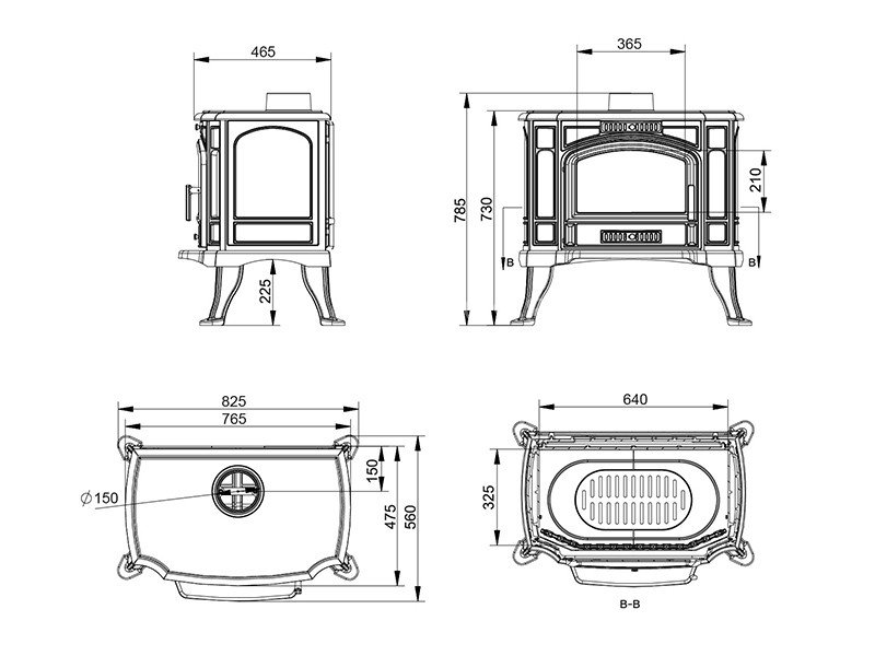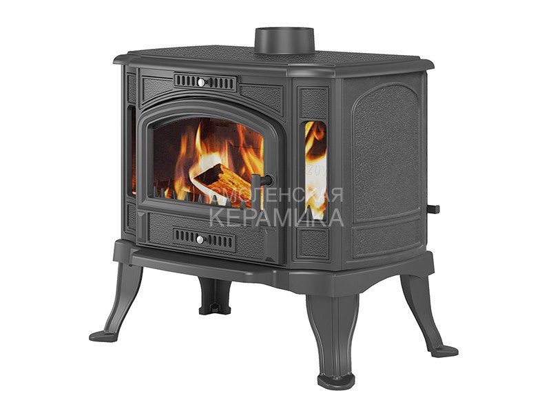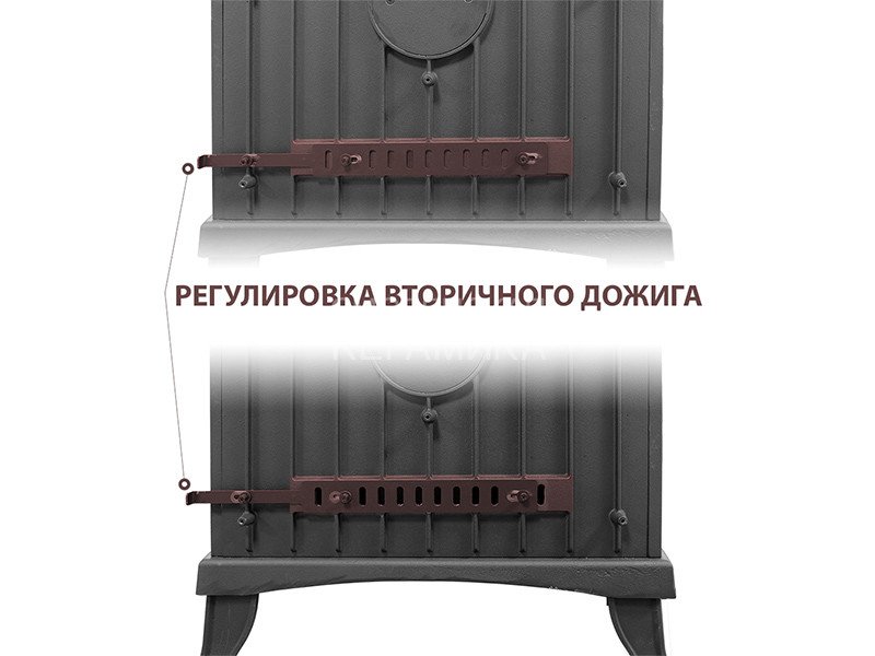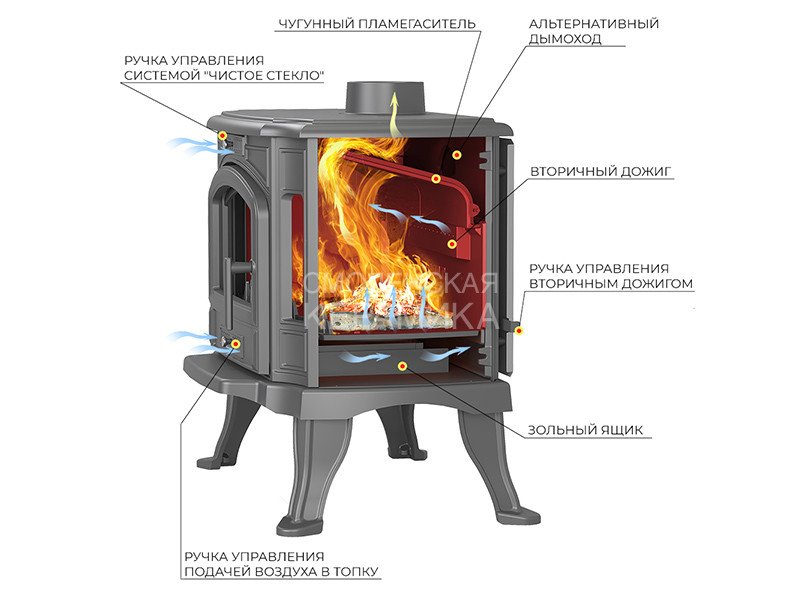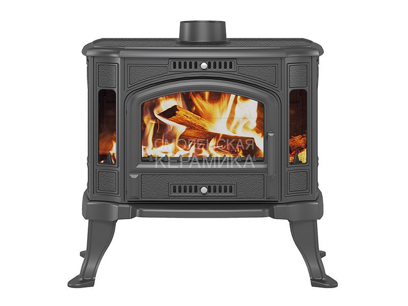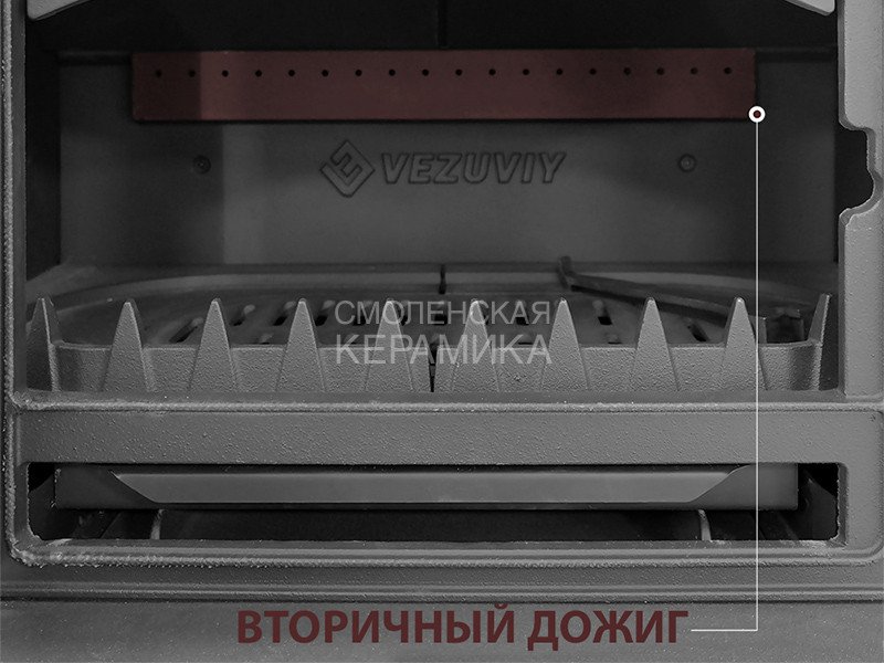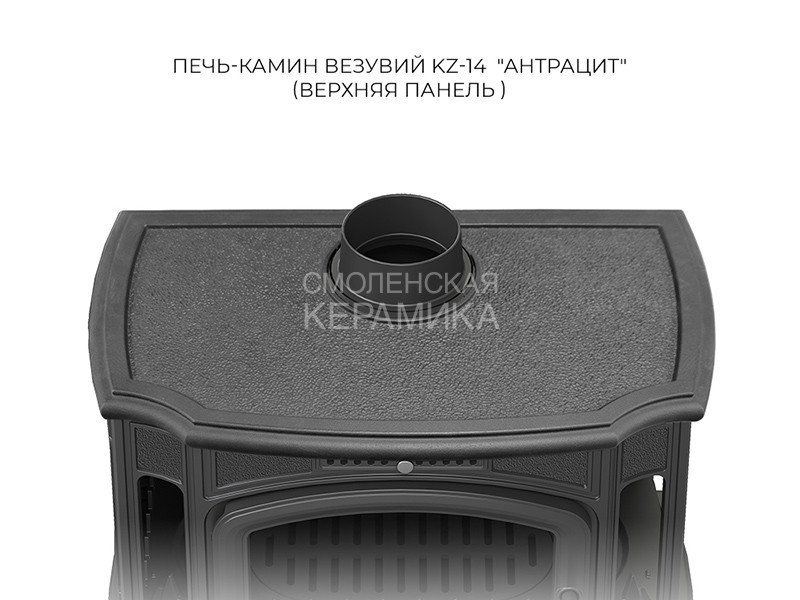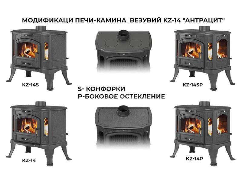 Печь-камин Везувий KZ-14 изготовлена из качественного чугуна с толщиной стенки 8-10 мм. Модель рассчитана на обогрев помещений объёмом до 280 м³.Топочная камера с двойными чугунными стенками. В нижней панели предусмотрена колосниковая решётка. Дверь изготовлена из чугуна и оснащена большим панорамным стеклом в виде арки. С двух сторон от двери установлены две стеклянные вставки. На модели KZ-14Р по бокам установлены стекла. Чистота стекла во время работы обеспечивается системой подачи воздуха на внутреннюю сторону стекла. Воздух отсекает дымовые газы и пламя от поверхности стекла, предотвращая закопчение и потемнение стекла. На моделях KZ-14 , KZ-14S Ручка управления системой размещена в верхней части передней панели, над дверью у KZ-14Р с боку над стеклом. В нижней части двери размещена ручка задвижки для подачи воздуха на первичное горение. Вторичный дожиг в печи-камине обеспечивается двойной задней стенкой: здесь между стенкой и внутренней облицовкой топки из чугуна есть канал, идущий из поддувала под ниж