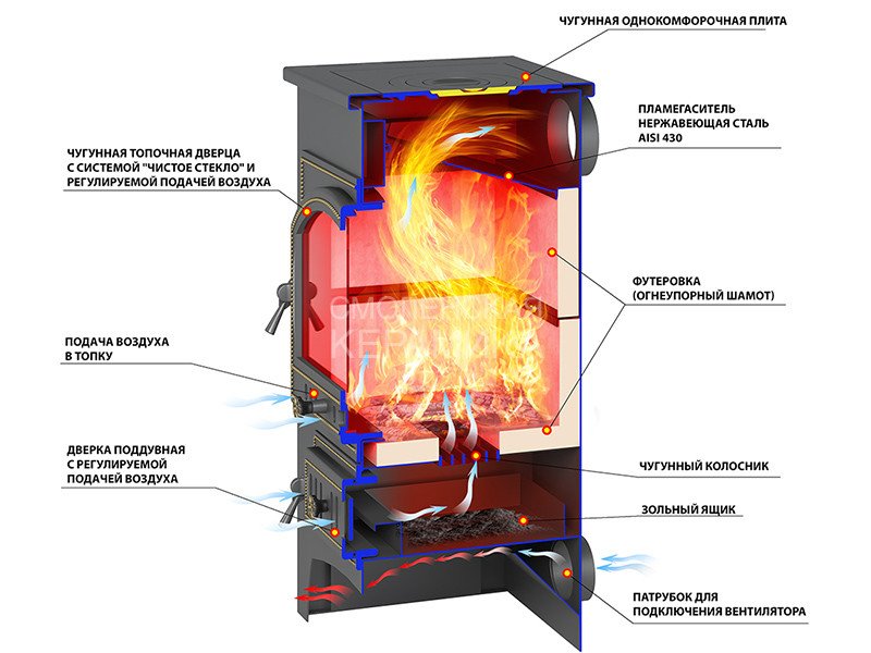 Чугунная поддувальная дверь с системой регулировки режимов горения.