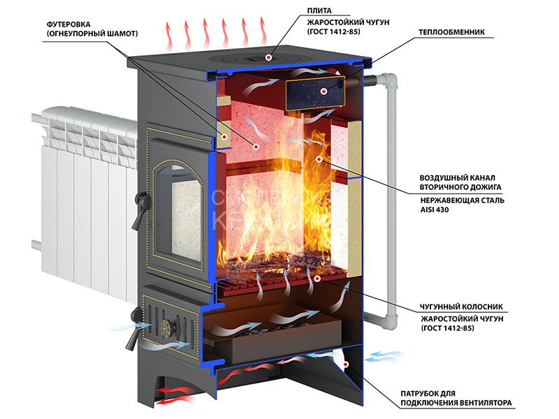 Чугунная поддувальная дверь с системой регулировки режимов горения.