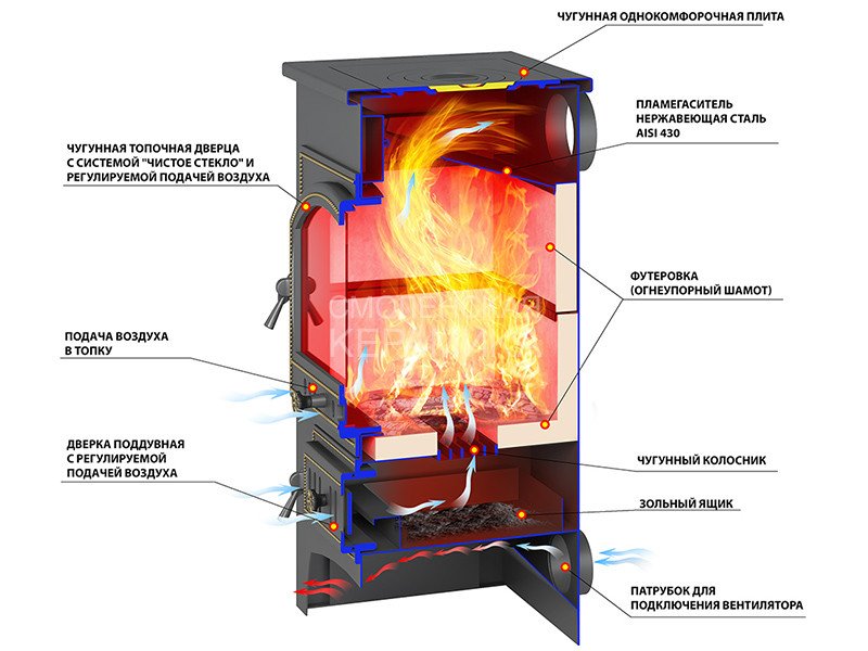 Чугунная поддувальная дверь с системой регулировки режимов горения.