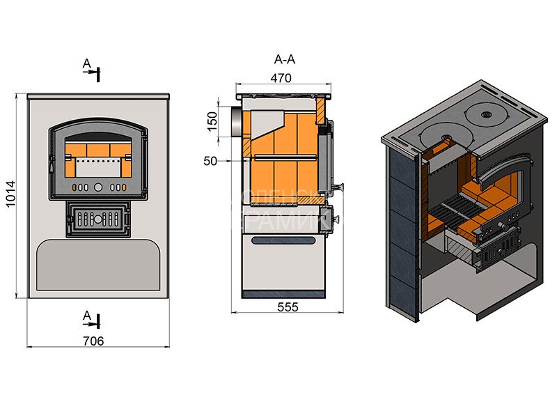 Топка печи-камина футерована высококачественным шамотом, что защищает металл топки от воздействия высоких температур, продлевая срок службы печи. Шамот отлично аккумулирует тепло, позволяя обогревать помещение в течении 2-х часов после окончания топки печи.