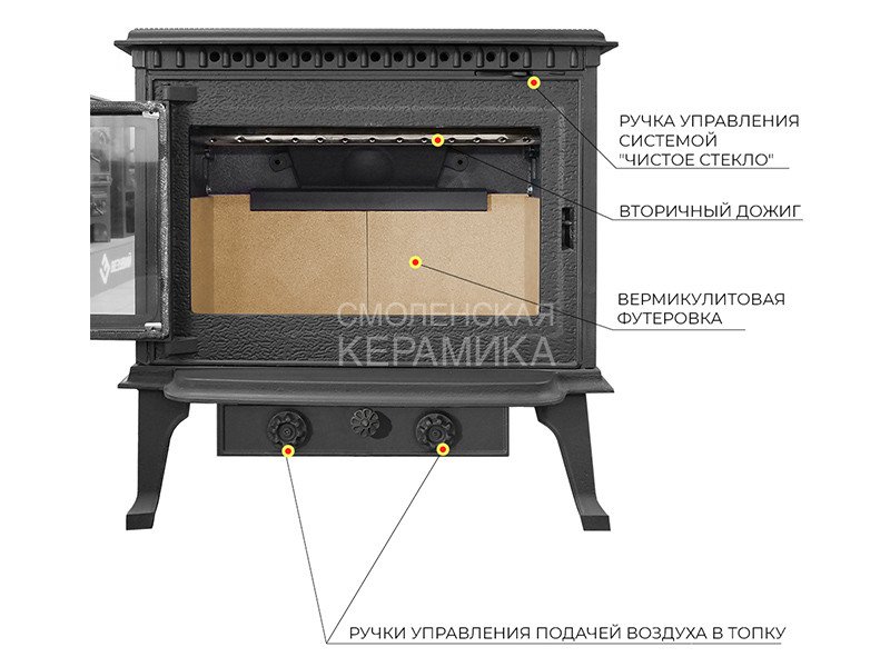 Над дверцей печи-камина расположена система чистое стекло, которая помогает оставаться стеклу чистым. В нижней части под топкой расположены две вращающиеся заслонки для регулировки подачи воздуха в колосниковую зону, которые помогают контролировать интенсивность горения.