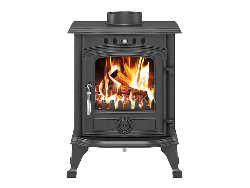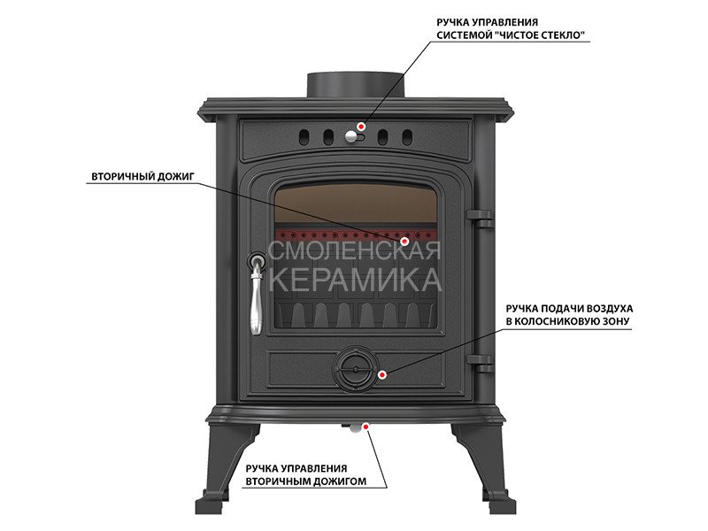 Над дверцей печи-камина расположена система чистое стекло, которая помогает оставаться стеклу чистым. В нижней части дверцы расположена ручка для регулировки подачи воздуха в колосниковую зону.