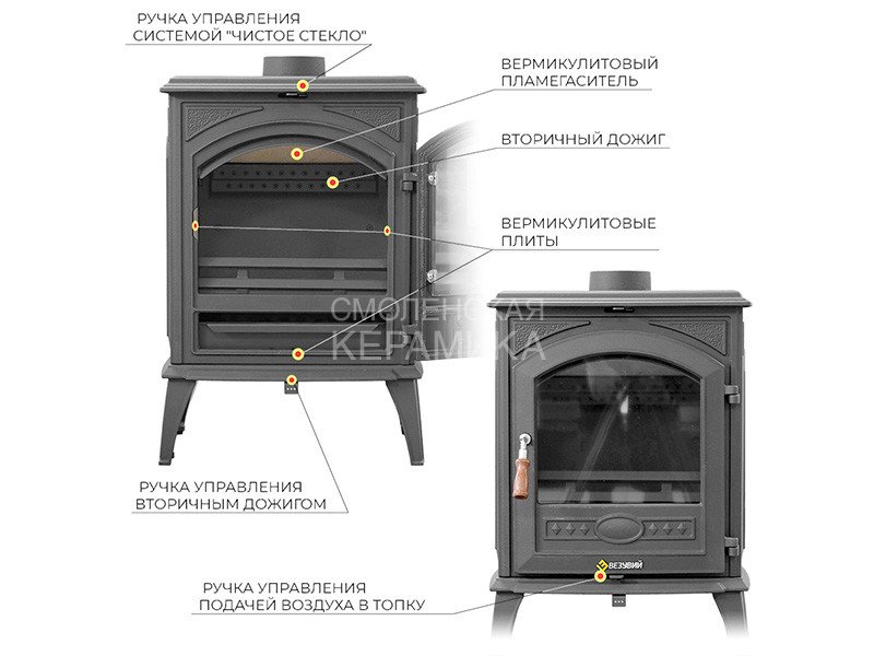 Топочная камера футерована вермикулитом, который повышает КПД и ресурс изделия за счет равномерной отдачи тепла.