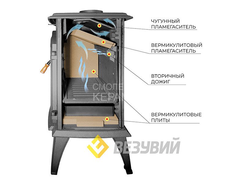 Также в печи предусмотрен не только вермикулитовый, но и чугунный пламегаситель; в паре они обеспечивают более эффективную работу топки, отдавая максимум тепла ее стенкам и предотвращая теплопотери.