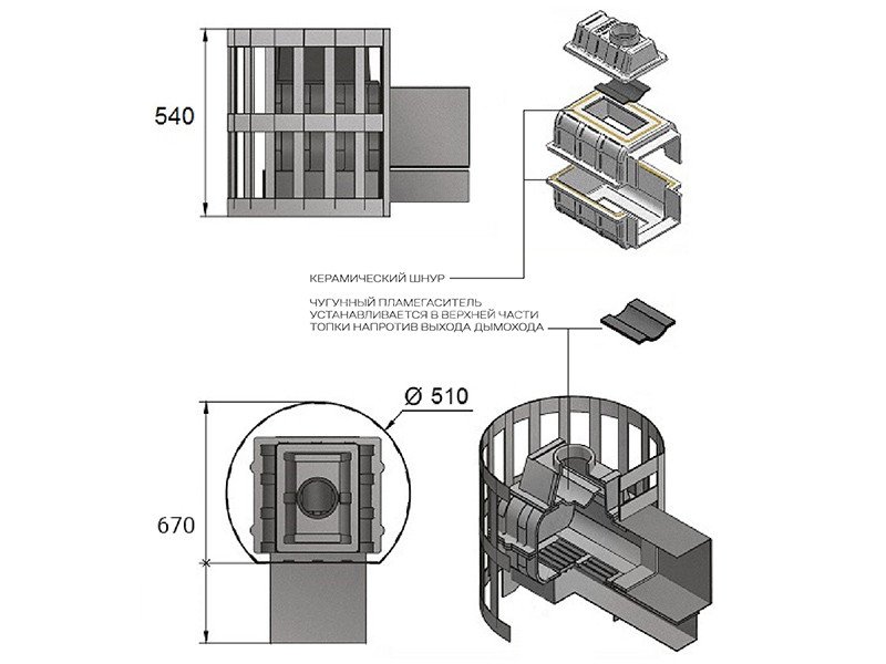 Преимущество печи в том, что топка печи состоит из 3-х элементов. На стыке между ними используется керамический шнур с рабочей температурой 1200 градусов. То есть топка печи абсолютно герметична! Для фиксации деталей между собой применяется болтовое соединение, что даёт 100% гарантию безопасности при эксплуатации.