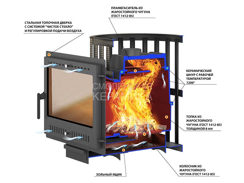 Преимущество печи в том, что топка печи состоит из 3-х элементов. На стыке между ними используется керамический шнур с рабочей температурой 1200°C. То есть топка печи абсолютно герметична! Для фиксации деталей между собой применяется болтовое соединение, что даёт 100% гарантию безопасности при эксплуатации.