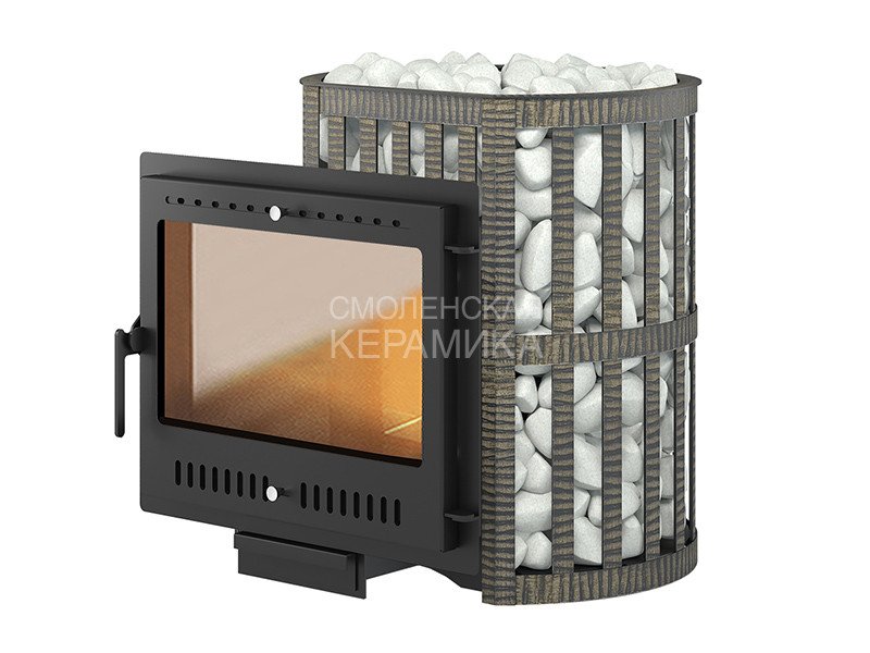 Банная чугунная печь Легенда Ковка 22 Панорама "М" укомплектована металлической герметичной дверцей Везувий Панорама "М". Конвекционно-вентилируемый кожух "Ковка" изготовлен из металлической текстурированной полосы покрашенной термостойкой краской и покрытая патиной «Бронза».