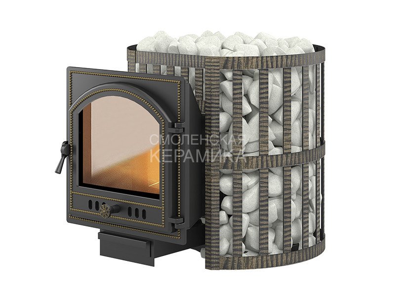 Банная чугунная печь Легенда Ретро 24 Ковка (205) укомплектована чугунной герметичной дверцей Везувий 205 с жаропрочным стеклом «SCHOTT ROBAX» и системой очистки стекла. Конвекционно-вентилируемый кожух "Ковка" изготовлен из металлической текстурированной полосы покрашенной термостойкой краской и покрытая патиной «Бронза».