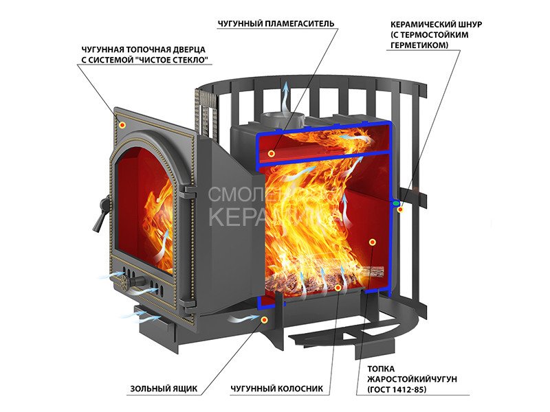 Новая линейка чугунных банных печей Везувий Легенда Ретро, отличается от других моделей банных печей компании Везувий прежде всего тем, что все элементы конструкции печи изготовлены из жаропрочного чугуна толщиной не менее 12 мм. Также, в изменена конструкция печной топки: верхняя часть топки и дымосборник сделаны цельными, а сама топка состоит всего из двух деталей: нижняя колосниковая часть и верхняя часть со встроенным колпаком-дымосборником. Это делает конструкцию более безопасной, уменьшает количество соединений и швов, которые традиционно являются слабыми местами в любой печи или топке.