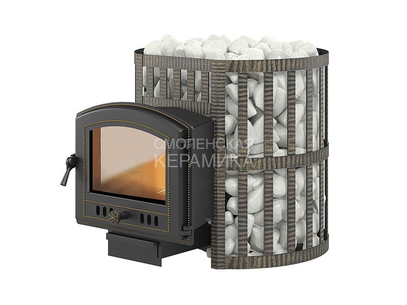 Банная чугунная печь Легенда Ретро 24 Ковка (224) укомплектована чугунной герметичной дверцей Везувий 224 с жаропрочным стеклом «SCHOTT ROBAX» и системой очистки стекла. Конвекционно-вентилируемый кожух "Ковка" изготовлен из металлической текстурированной полосы покрашенной термостойкой краской и покрытая патиной «Бронза».