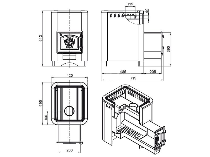 Стальная топка имеет скошенные углы в нижней части боковых стенок, что делает уход за топочным пространством максимально простым, а эффективность сгорания дров – максимальным.