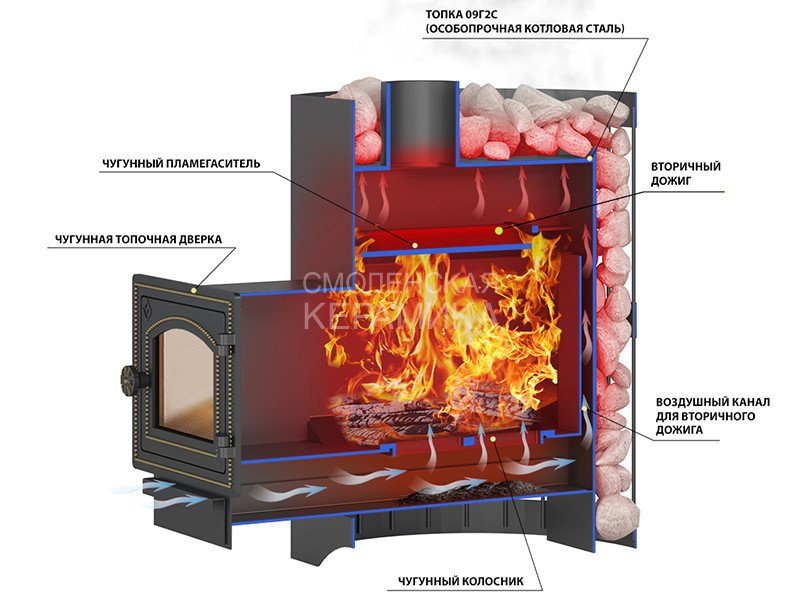 Топка оснащена каналом для подачи воздуха на вторичный дожиг дымовых газов. Канал проходит по задней стенке топки снизу вверх и подаёт воздух для горения в верхние отделы топки. Такая конструкция повышает экономичность печи и увеличивает КПД агрегата.