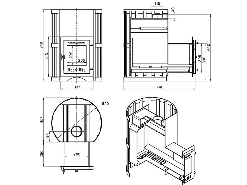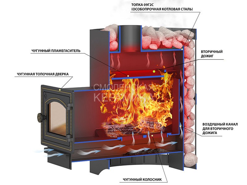 Печь изготовлена из особо прочной котловой стали 09Г2С, рассчитанной на работу при высоких температурах и давлении. Толщина стенок печи 4-6 мм. Топочный тоннель также выполнен из стали марки 09Г2С толщиной 4 мм, и позволяет использовать дрова длиной более 50 см.Топка оснащена каналом для подачи воздуха на вторичный дожиг дымовых газов. Канал проходит по задней стенке топки снизу вверх и подаёт воздух для горения в верхние отделы топки. Такая конструкция повышает экономичность печи и увеличивает КПД агрегата.Съёмный чугунный колосник в сочетании со скошенными краями боковой части стенки облегчает уход за топкой, уборку золы и несгоревших углей.Воздух в зону горения подаётся через поддувало, спереди закрытое дверью печи.Стальная дверь изготовлена из осо