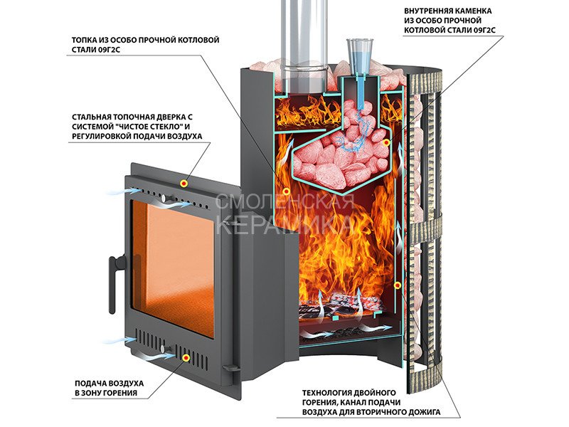 За счёт правильного расположения каменки, температура разогрева камней может достигать 500-550 градусов, что поз