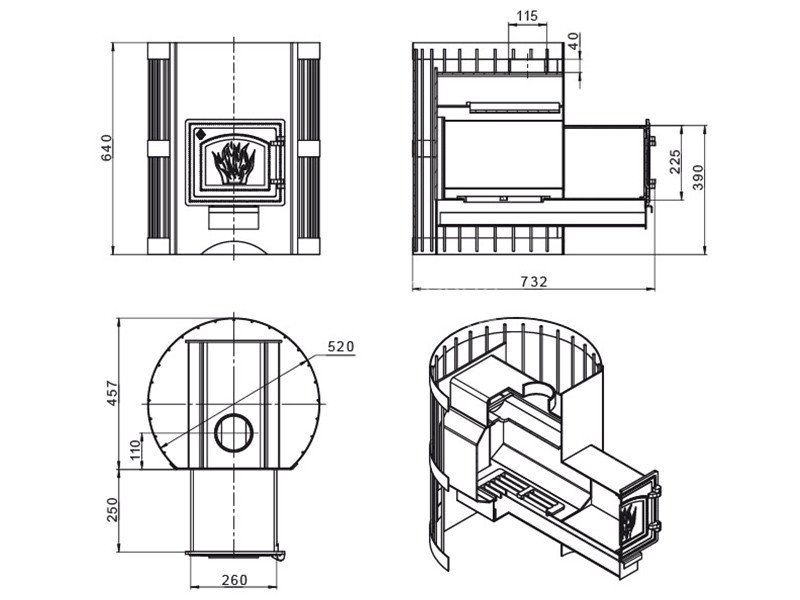 Съёмный чугунный колосник в сочетании со скошенными краями боковой части стенки облегчает уход за топкой, уборки золы и несгоревших углей.