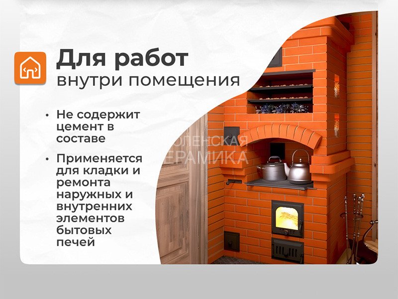 Применяется для кладки и ремонта наружных и внутренних элементов бытовых печей, каминов, дымоходов из керамического и огнеупорного кирпича.