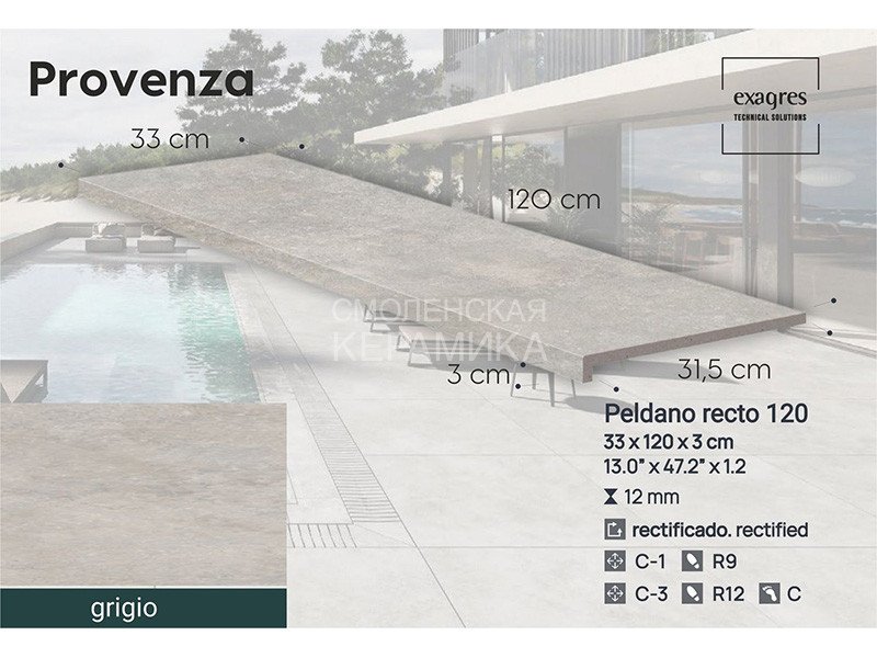 Ступень прямая противоскользящая Peldano recto 120, C3 Exagres Provenza Grigio