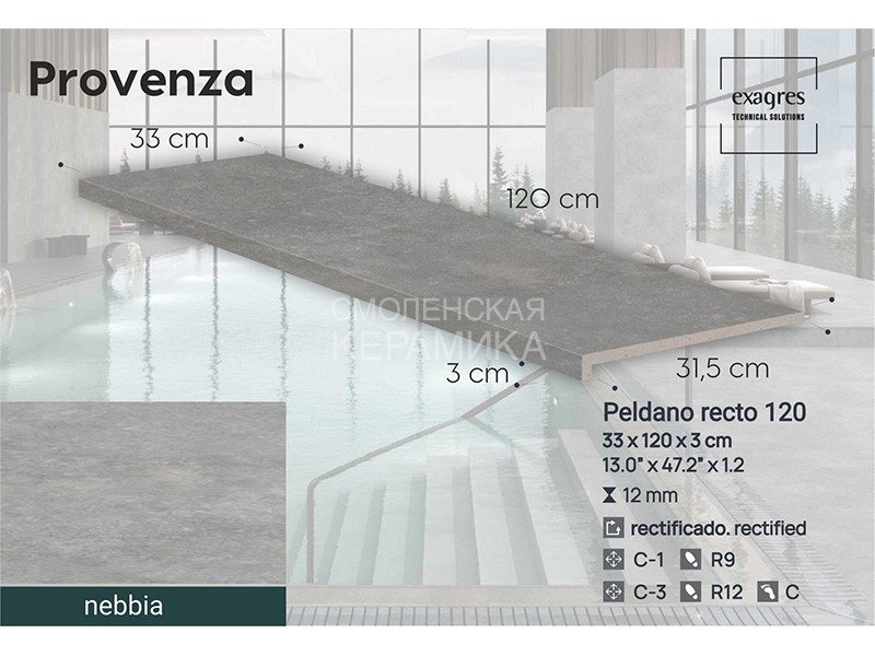 Ступень прямая противоскользящая Peldano recto 120, C3 Exagres Provenza Nebbia